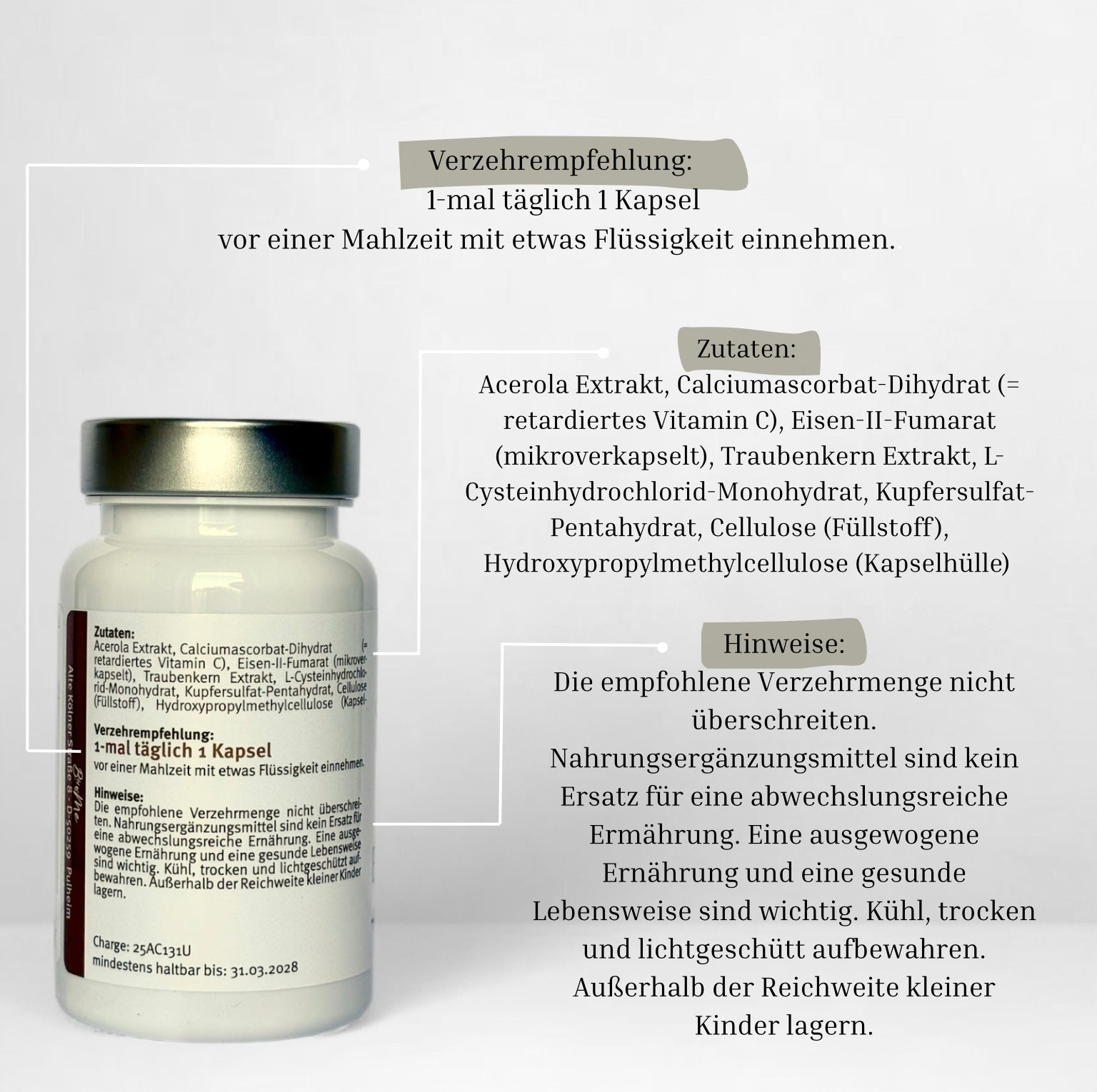 Die empfohlene Verzehrmenge nicht überschreiten. Nahrungsergänzungsmittel sind kein Ersatz für eine abwechslungsreiche Ernährung. Eine ausgewogene Ernährung und eine gesunde Lebensweise sind wichtig. Kühl, trocken und lichtgeschützt aufbewahren. Außerhalb der Reichweite kleiner Kinder lagern.